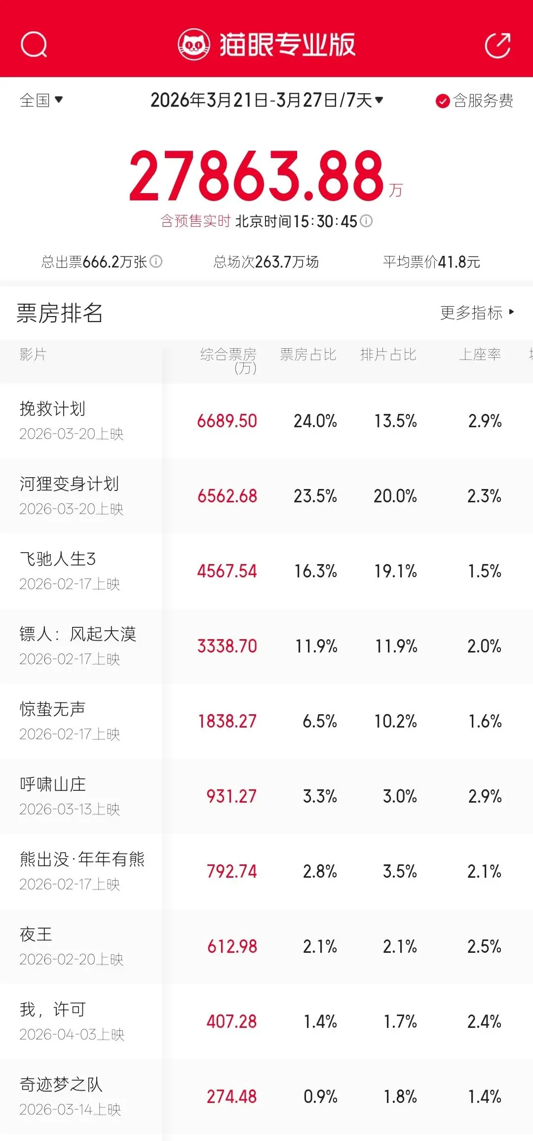 刚刚过去的这一周,影市相对平稳。根据猫眼专业版的数据,本周,新上映的影片《挽救计划》《河狸变身计划》占据了排行榜前两位,霸屏已久的春节档影片则退居三至五位。可以看到,观众的口味依然多元,无论是持续发力的春节档,还是新上映的剧情片,都在这个春天找到了自己的观众。