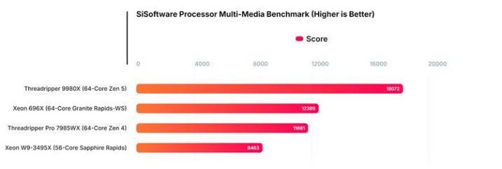 在SiSoftware中的多媒体基准测试中,酷睿至强696X处理器获得了12389.50 Mpix/s的成绩,与上一代W9-3495X相比提升了46%,这个幅度还是相当不错的,除此之外也比线程撕裂者Pro 7985WX处理器更强,当然至强696X处理器也并非是英特尔下一代至强处理器中的旗舰型号,预计698X处理器还能取得更加出色的成绩。可以说英特尔想要让新一代的至强处理器中重新收复被AMD线程撕裂者处理器所抢走的市场份额,显然核战是最佳的手段。