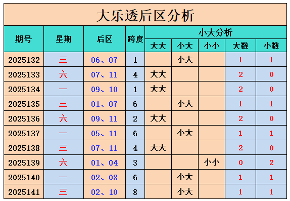 最近10期后区大小比为13:7,最近10期后区大大组合开出4期,小大组合开出5期,小小组合开出1期。上期开出小大组合,本期看好小大组合出现。